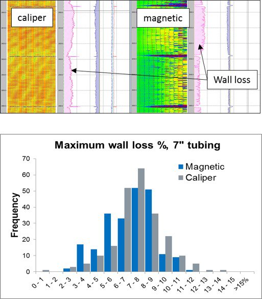 The typical results for the 7” tubing are shown in the figure opposite. Although the sensor measurements from each tool are very different, a comparison of the continuous wall loss curves and summary overlay histograms provides assurance that the maximum wall loss per joint body is limited and there is no significant external corrosion. The findings from both tools verified that the underground gas storage facility could continue operating at the highest possible safe working pressure.