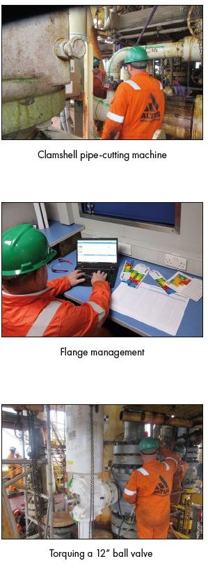 In excess of 1000 joints ranging from ½” to 24” were disturbed, tightened and tested successfully without any leaks. Maintenance was carried out on various systems, ranging from compressors, scrubbers, fuel gas, separators and water injection to name but a few, and were managed within the Altus Flange Management System (AIMS).
