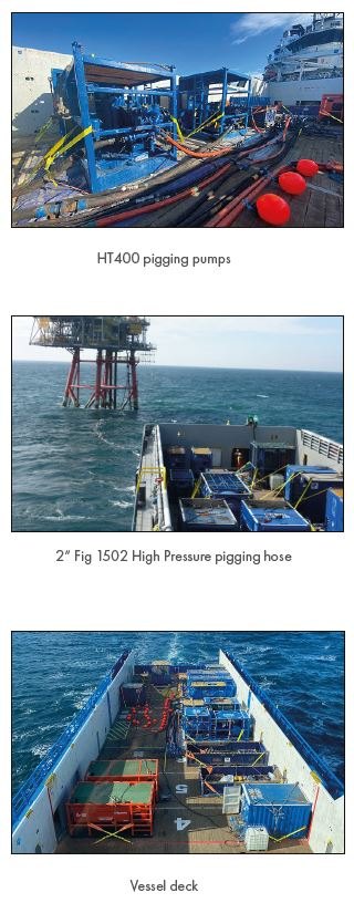 It was proposed to deploy Altus Intervention’s pumping spread from a UTV (Utility Vessel) thereby obviating the restricted crane from operational rig up and operational considerations. A 2” hydraulic power hose would be lifted by the platform crane and hooked onto a frac hanger via a 2” bracket on the platform. The 2” hose was then run along the platform and then tied into the launcher. The in-line inspection tool would then be pumped to the other platform. Altus Intervention’s personnel worked closely with the Client and the vessel crew throughout the operation.
