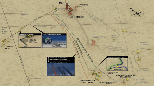Cayley Field – consists of two wells tied back to the Montrose BLP Platform via a bundle consisting of 8” Production, 4” Water Injection and 3” Gas lift.