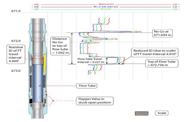 The top of the DHSV flow tube (FT) was located at 672.7 metres, which confirmed that the DHSV was in the open position. A slight decrease in the nominal internal diameter (ID) was found when the MFCT was run from the DHSV up through the tubing hanger, indicating potential scale/deposits. The average ID of the FT travel interval was measured at 0.039 inches (1 mm) less than the nominal ID of 4.949 inches. This was interpreted as a layer of scale preventing the FT from moving upwards, resulting in the DHSV flapper being stuck open. Three runs of the PrecisionBrush were made and the DHSV was brushed for a total of 3.5 hours. The DHSV was then function tested, found to be operational and the well was put back on production.