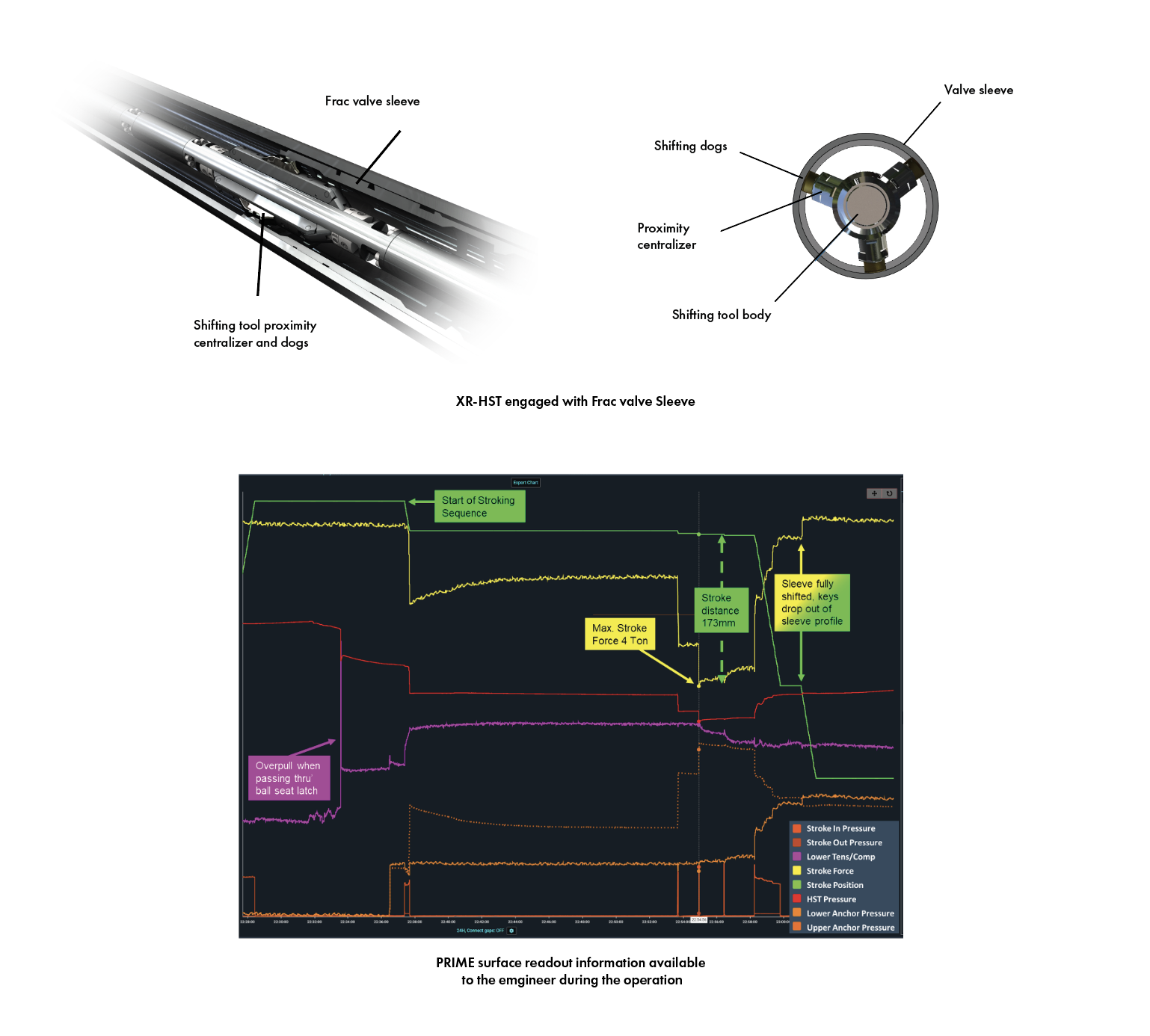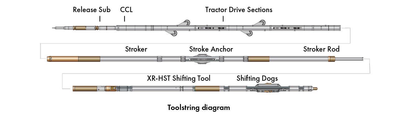 The operation was carried out successfully, with all six of the sleeves being shifted in a single run in the well. Higher forces were required to shift some of the sleeves, up to 5000kgs in one case – this significantly above the 300kg requirement as specified by the OEM. The PRIME stroker instrumentation provided realtime stroke distance and force information. This, coupled with realtime pressure readings from the XR-HST proximity centralizer and tension data from the tractors lower tension/compression sub combined to provide a high level of certainty throughout the sleeve shifting sequence. This allowed the engineer to better understand the in-situ situation and take immediate and controlled corrective actions, circumventing a false shift scenario due to sleeve seizing and the shifting tool slipping out of the shifting profile – in doing so delivering an efficient and successful operation.