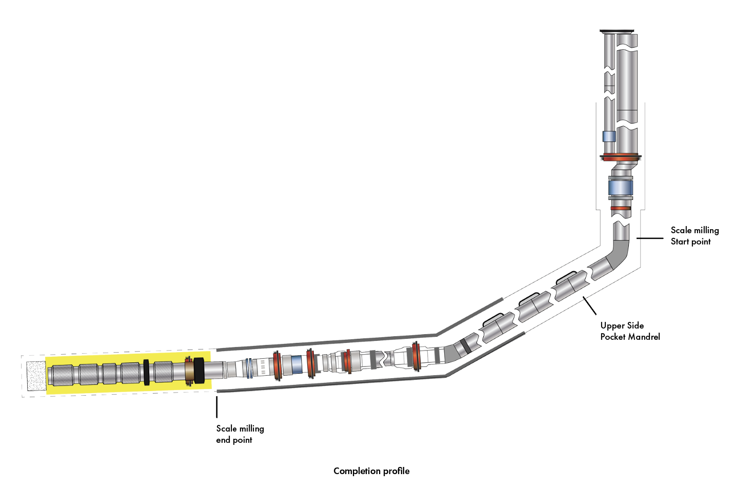 An initial run was made using the wellbore cleanout toolstring, milling scale from 1580m to 2165m – approximately 30m below the upper SPM. The WASP® tool was then run, without any hold up issues, and activated as planned at the SPM depth. Following this,