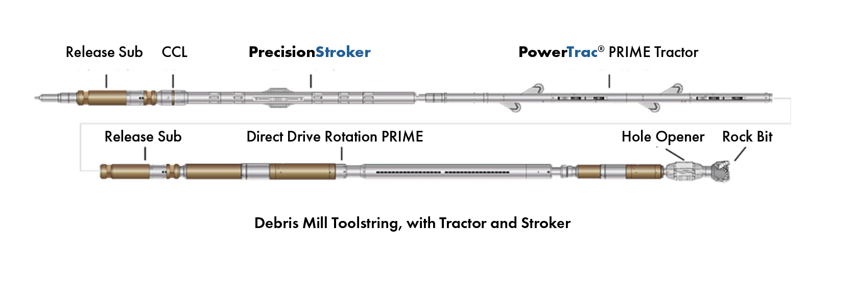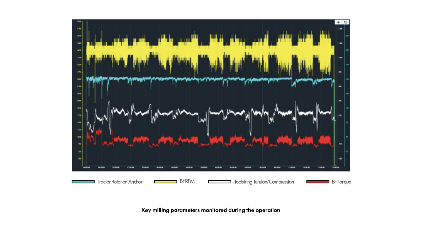 Altus Intervention recommended to utilize the new PRIME Technology platform combined with the PrecisionDebris Mill to remove the extensive amount scale expected within the tubing and enable access for the subsequent Stroker/Kickover toolstring. The high level of instrumentation offered by the PowerTrac® PRIME Tractor and PRIME Direct Drive Rotation device and its full system capabilities would provide real-time visibility and control of the key milling parameters, stuck prevention from continual rotation of the bit during pick-up cycles, and ensure efficiencies from minimal stall out and stall recovery.
