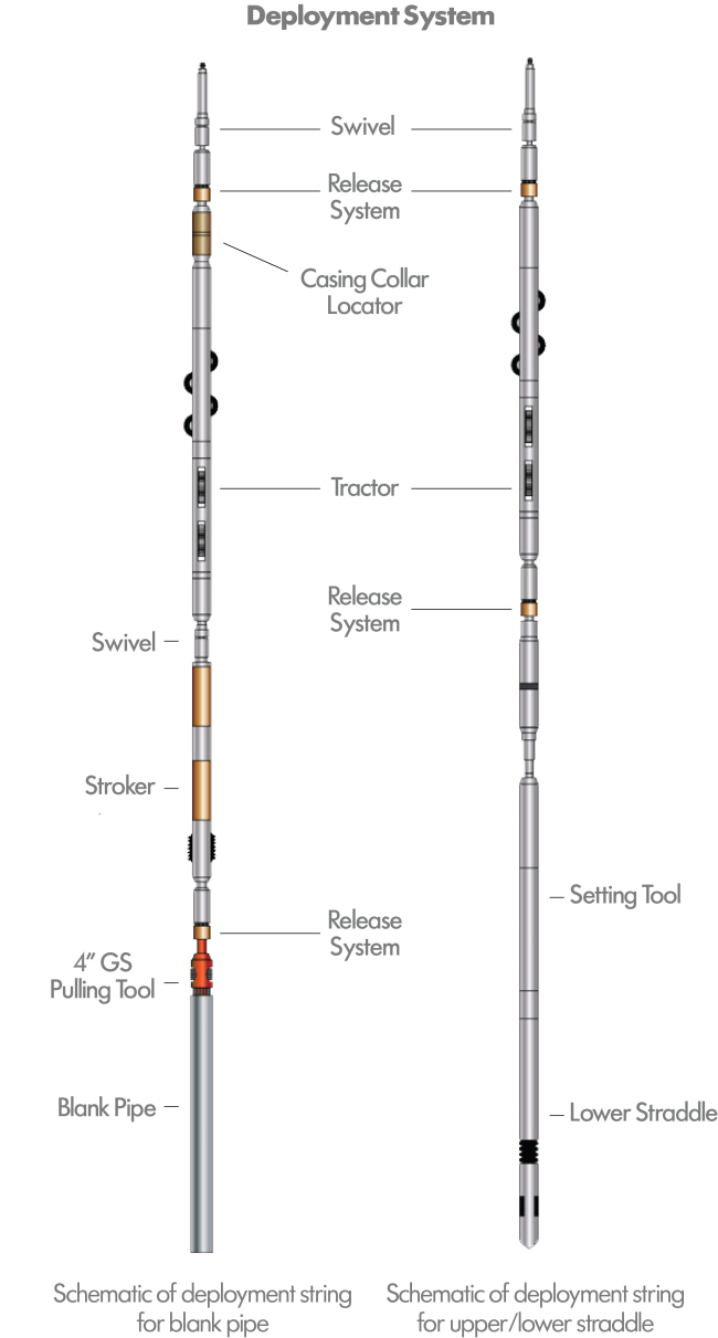 A stackable straddle system was deployed to effectively shut off the upper zone gas production. E-Line deployment of the stackable straddle system using the PowerTrac® for conveyance and the PrecisionStroker for the upper and lower packer setting was selected as the most precise and cost effective solution. Unlike Slickline, it could be deployed in a highly deviated well. Also, it offered a lighter footprint and shorter deployment times than a Coiled Tubing option. Production data and a distributed temperature log were used to calculate the optimum straddle length and wellbore placement position.