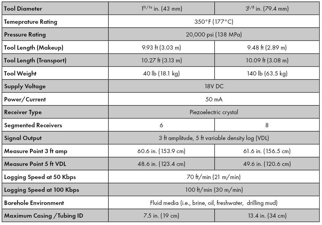 The RBT allows the detection of poor cement conditions before perforating, enabling proactive measures to be taken. Additionally, its small size, rigid isolator, and powerful transmitter allow through-tubing operations after the completion string is in place. In addition to the traditional 3 ft amplitude and 5 ft VDL, the RBT has a radially segmented, calibrated amplitude measurement. This focuses the transmitted sonic pulse circumferentially, allowing the differentiation of small axial channels as opposed to poor or contaminated cement.